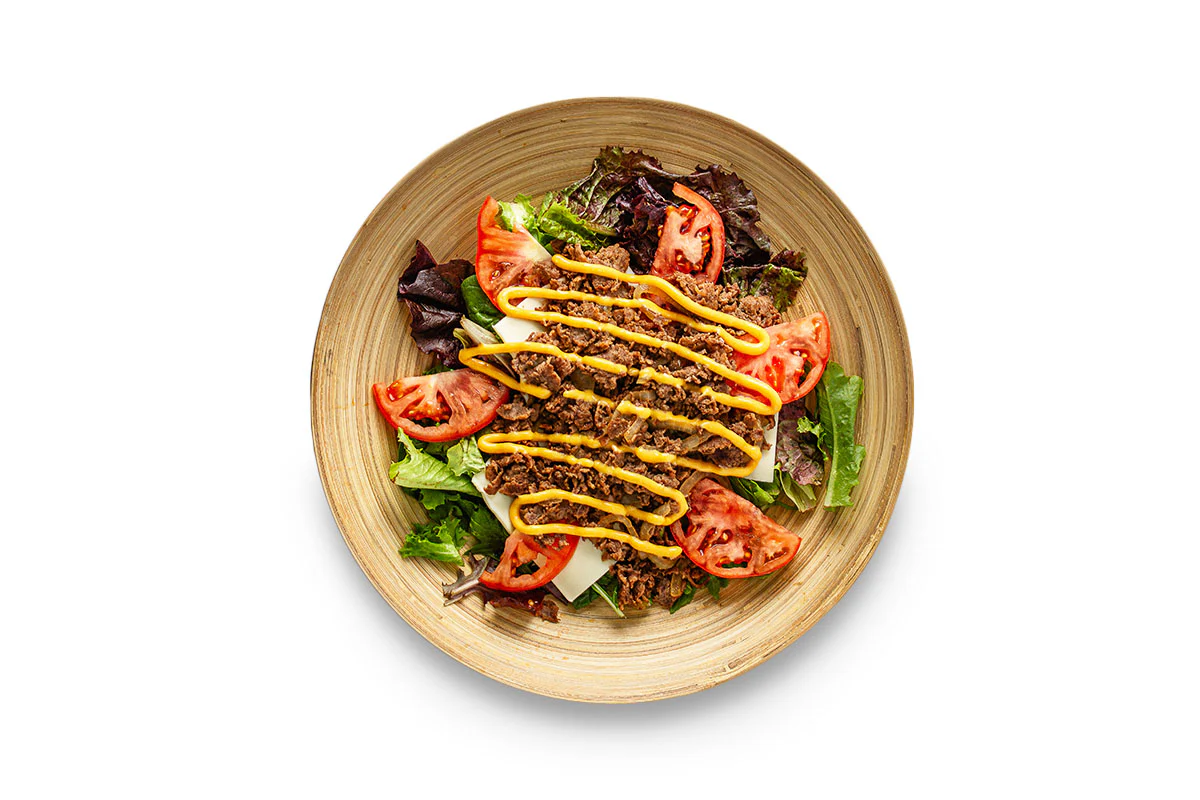 Philly Steak, Grilled Onions, Swiss American Cheese, & Cheese Whiz on Mixed Greens
