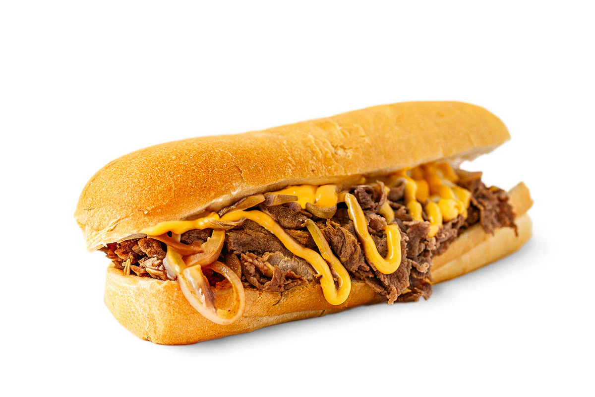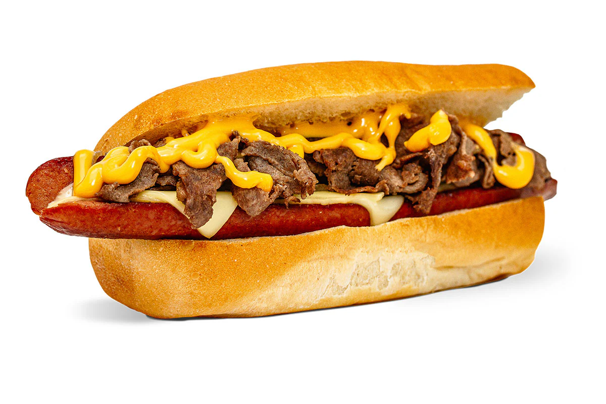 All Beef Hot Dog with Philly cheese steak topped with melted American cheese, grilled onions and Cheese Whiz