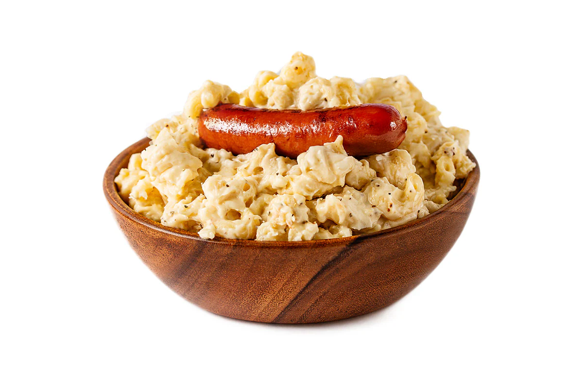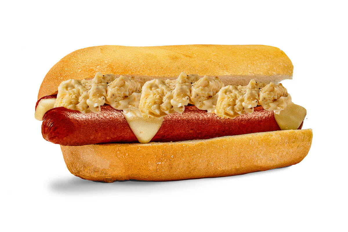 All Beef Hot Dog with mac and cheese topped with melted American cheese