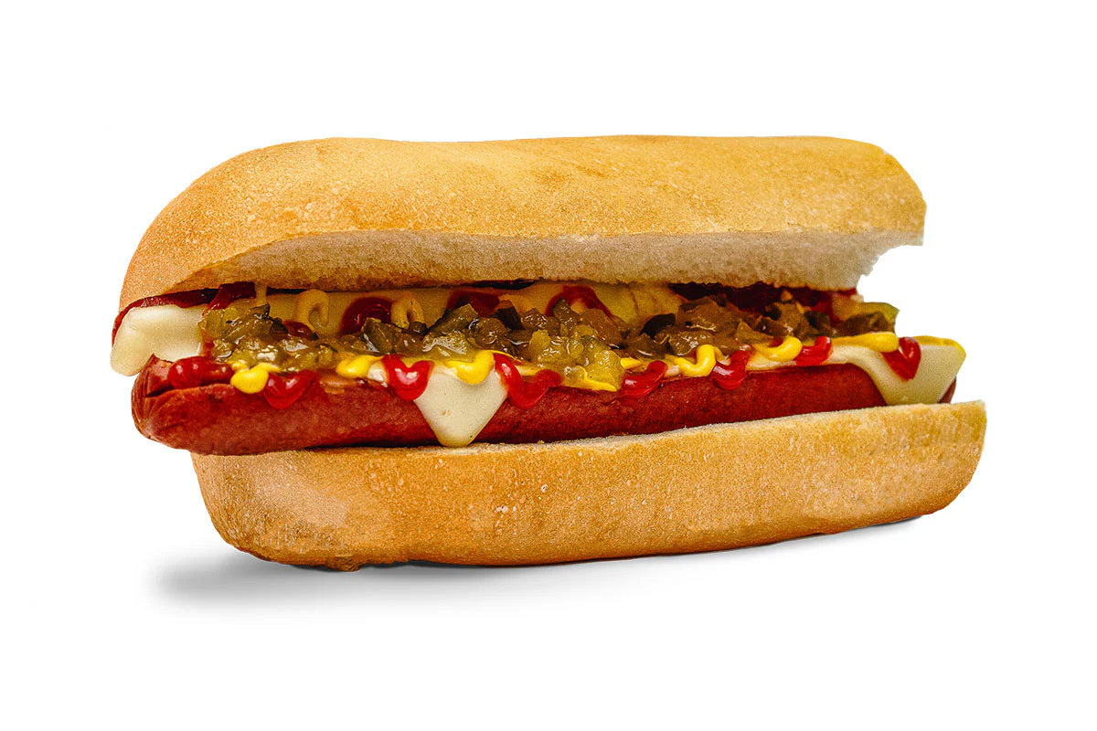 All beef hot dog topped with melted American cheese, ketchup, yellow mustard, and sweet pickle relish