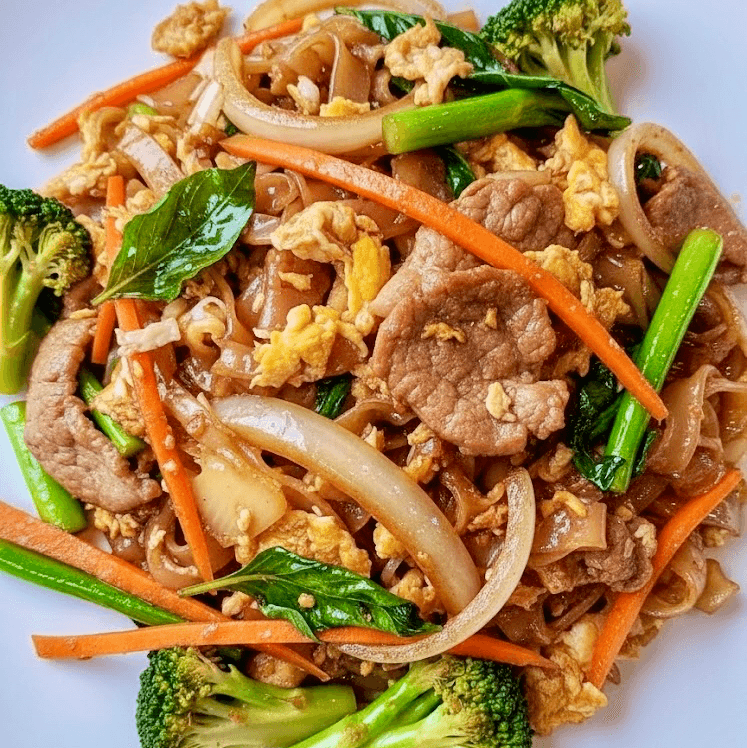 None GMO flat rice noodle wok stir fried with egg and your choice of proteins, broccoli and carrots tossed in sweet and savory dark beans sauce.