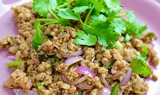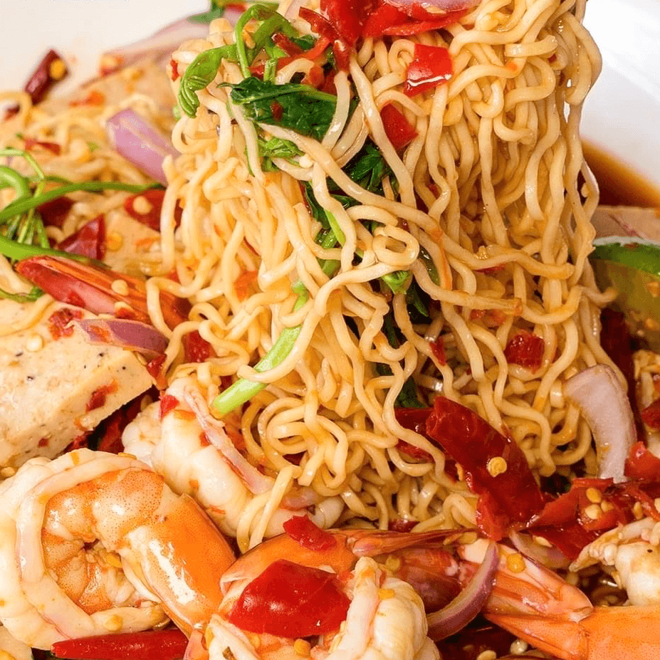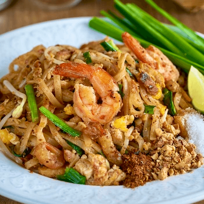 Steamed egg noodles tossed in spicy lime and tamarind dressing with your choice of proteins garnishes with fresh salad, onion and cilantro