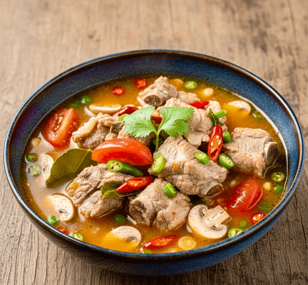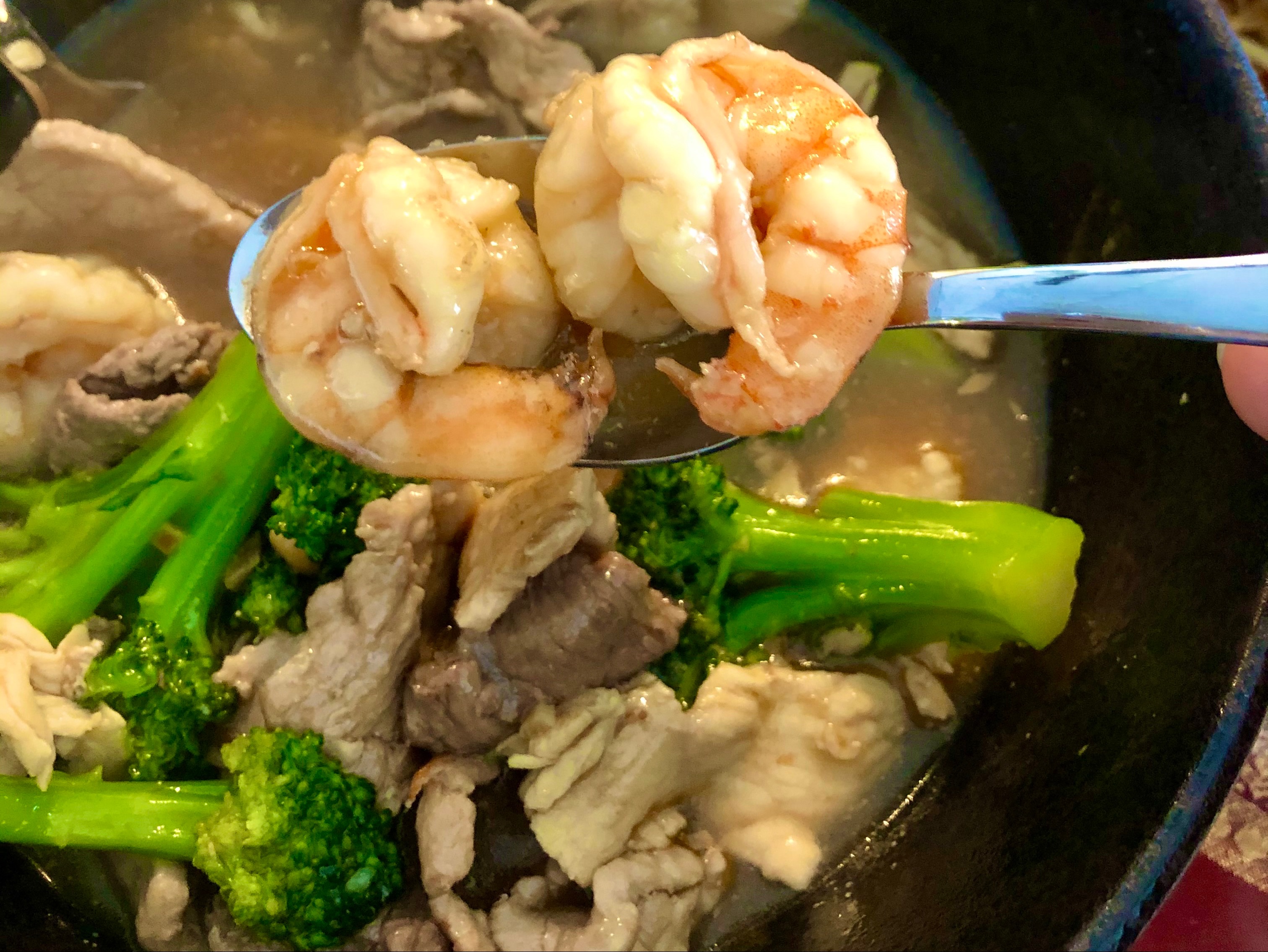 Your choice of proteins in Tomyum base soup (lemongrass’s, galangal, Kaffir lime) roasted rice powder, topped with fresh basil, cilantro and green onion served with steamed jasmine rice.