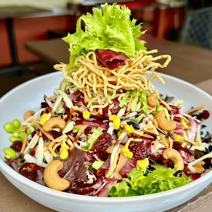 Steamed beansnoodles tossed in spicy lime and tamarind dressing with your choice of proteins garnishes with fresh tomato, mixed salad, onion and cilantro