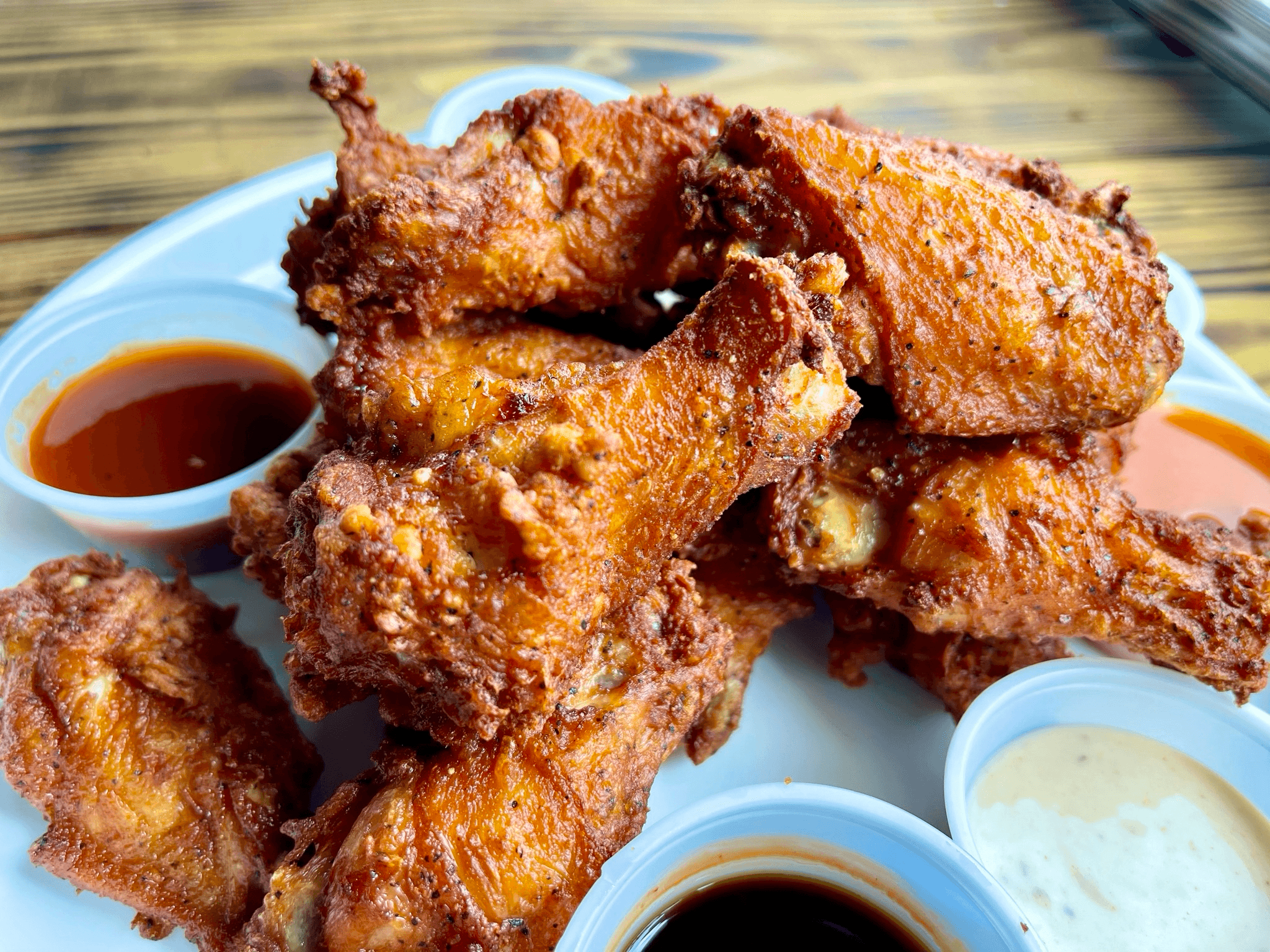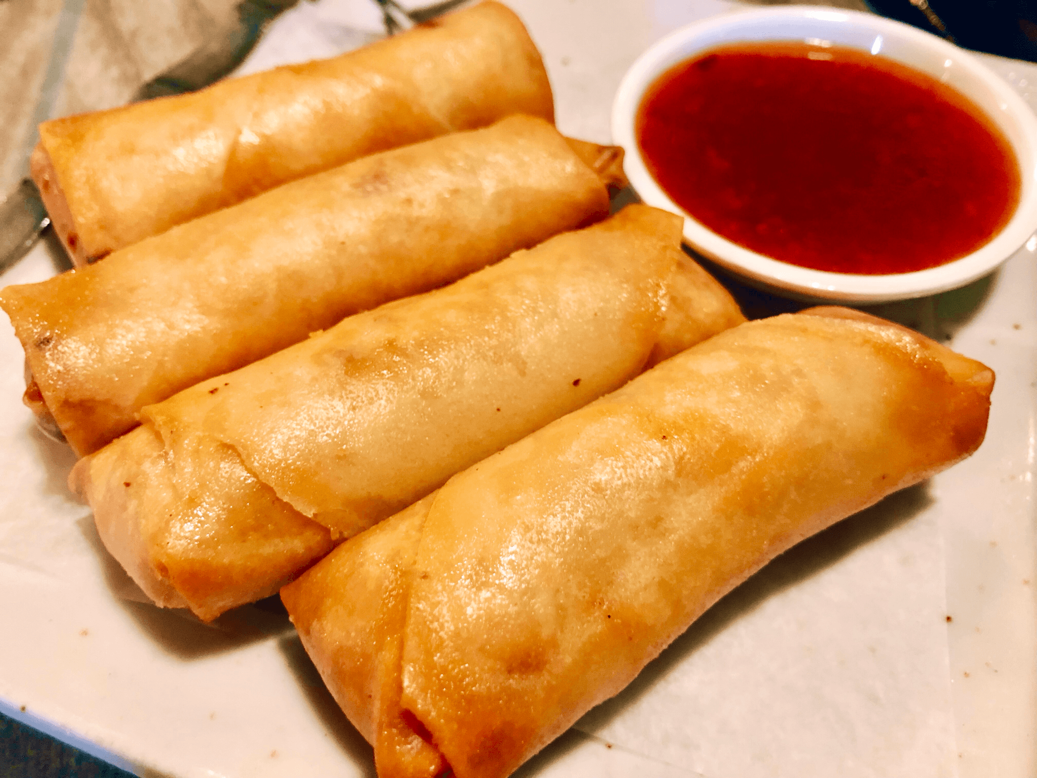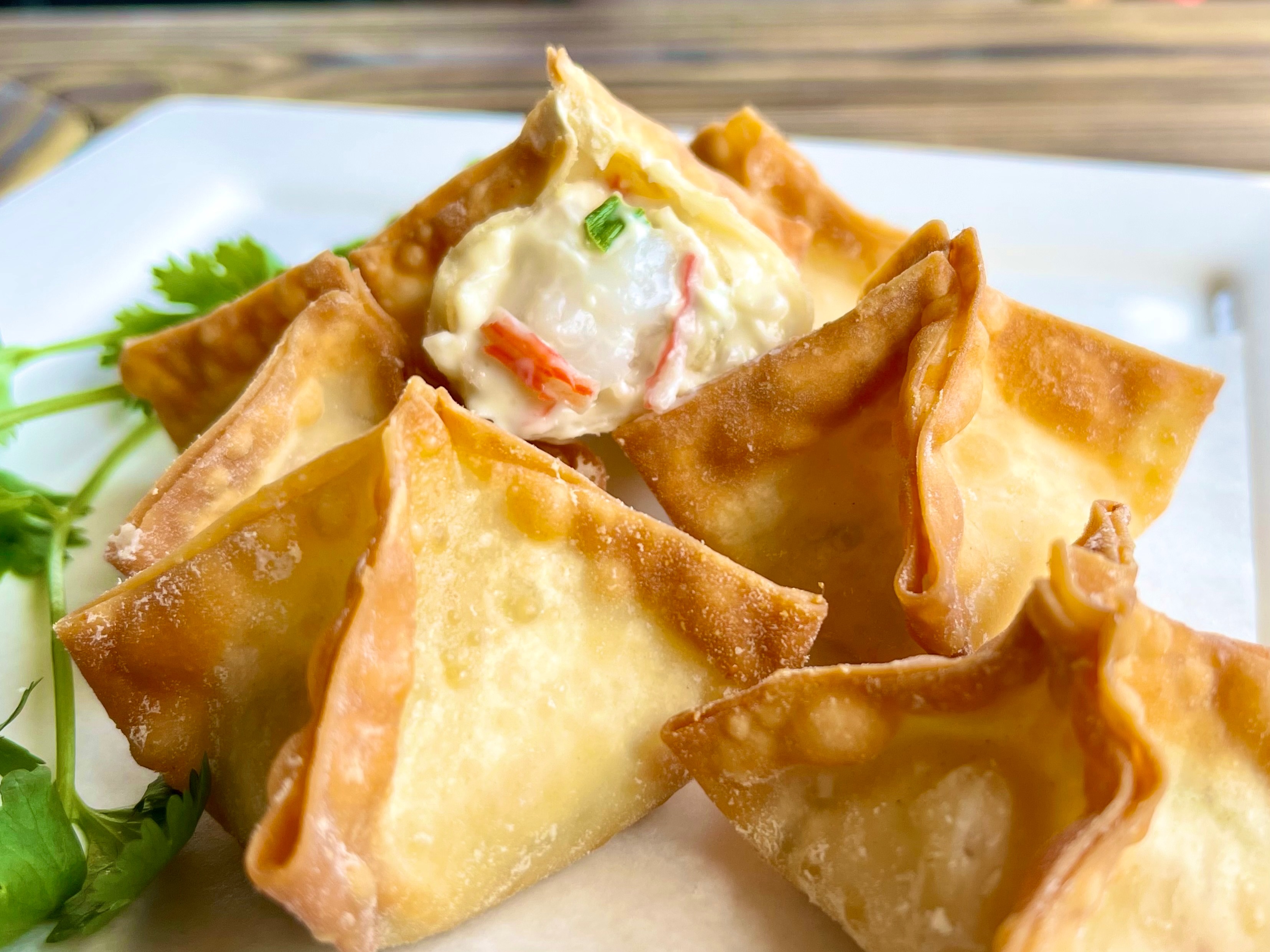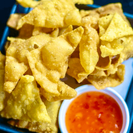 Crispy wonton skin filled with home made cream cheese served with sweet chili sauce or your choice of sauce for online order.