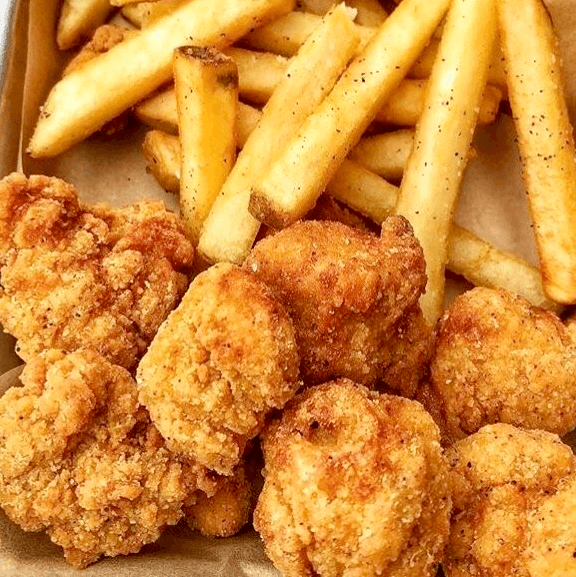 Gulf shrimps lightly batter with tempura flour crispy pan fried served with vinaigrette soy sauce and small salad.