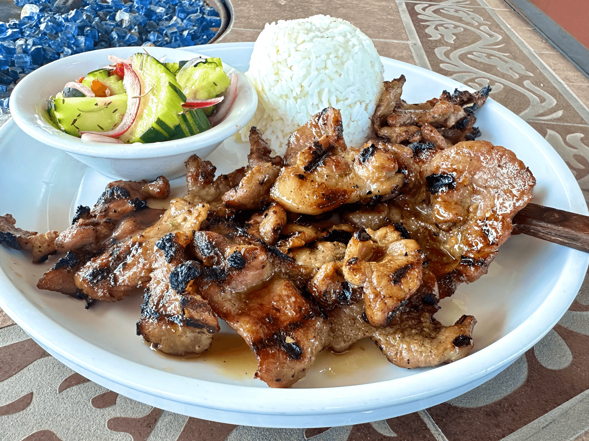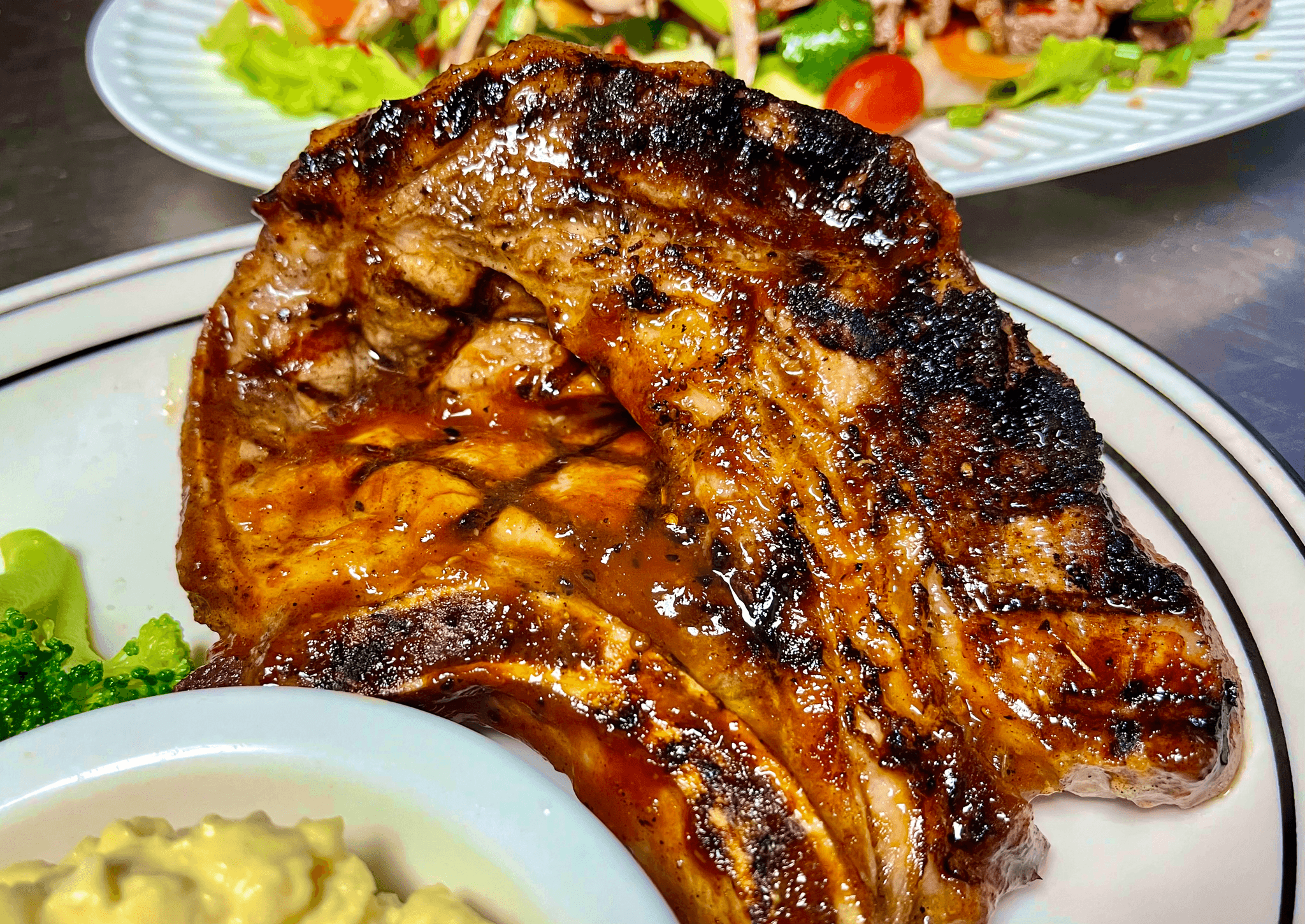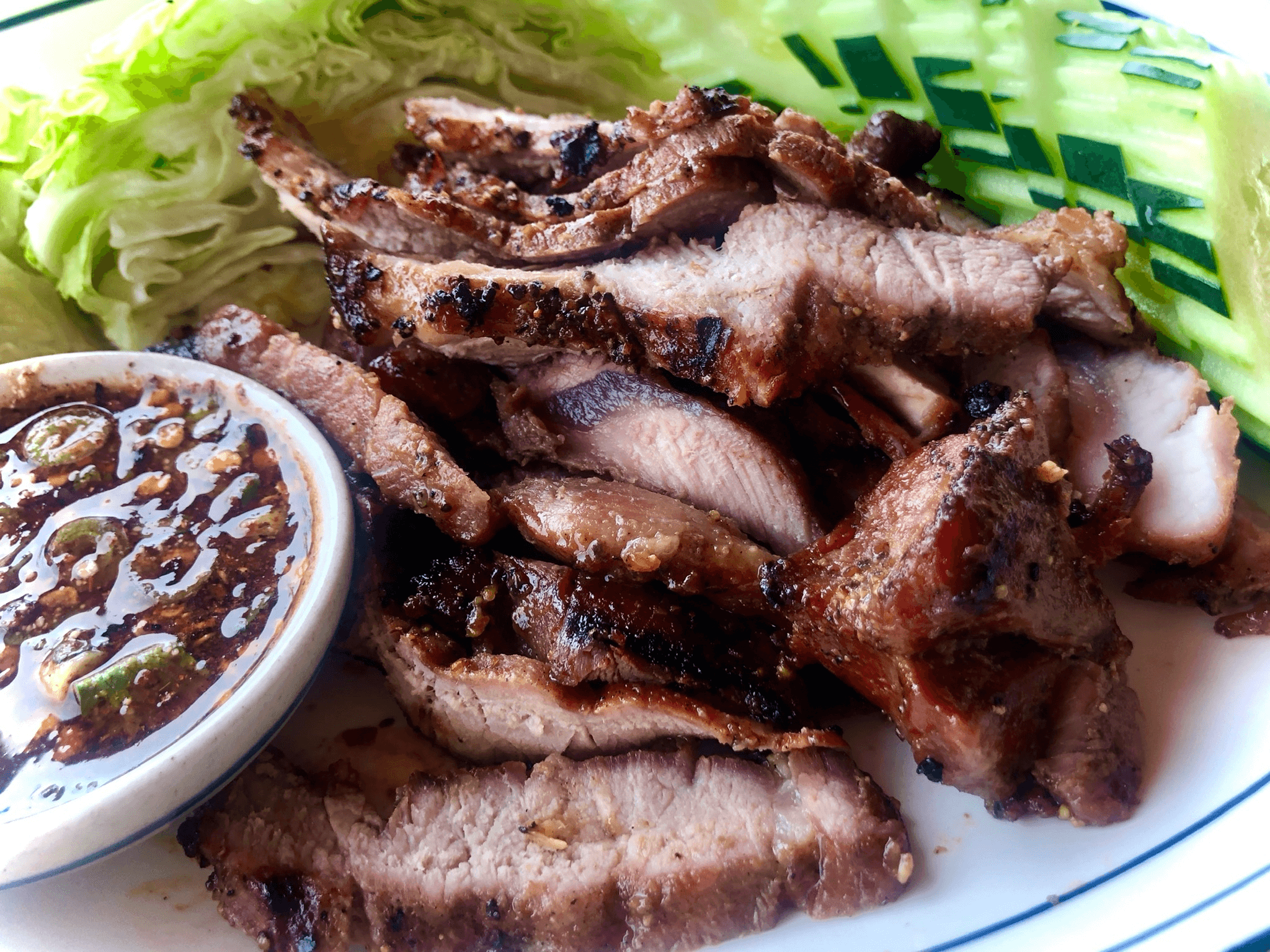 24 hour marinade grilled pork (12 oz.) served with salad, steamed jasmine rice and spicy tamarind or your choice of homemade sauces.
