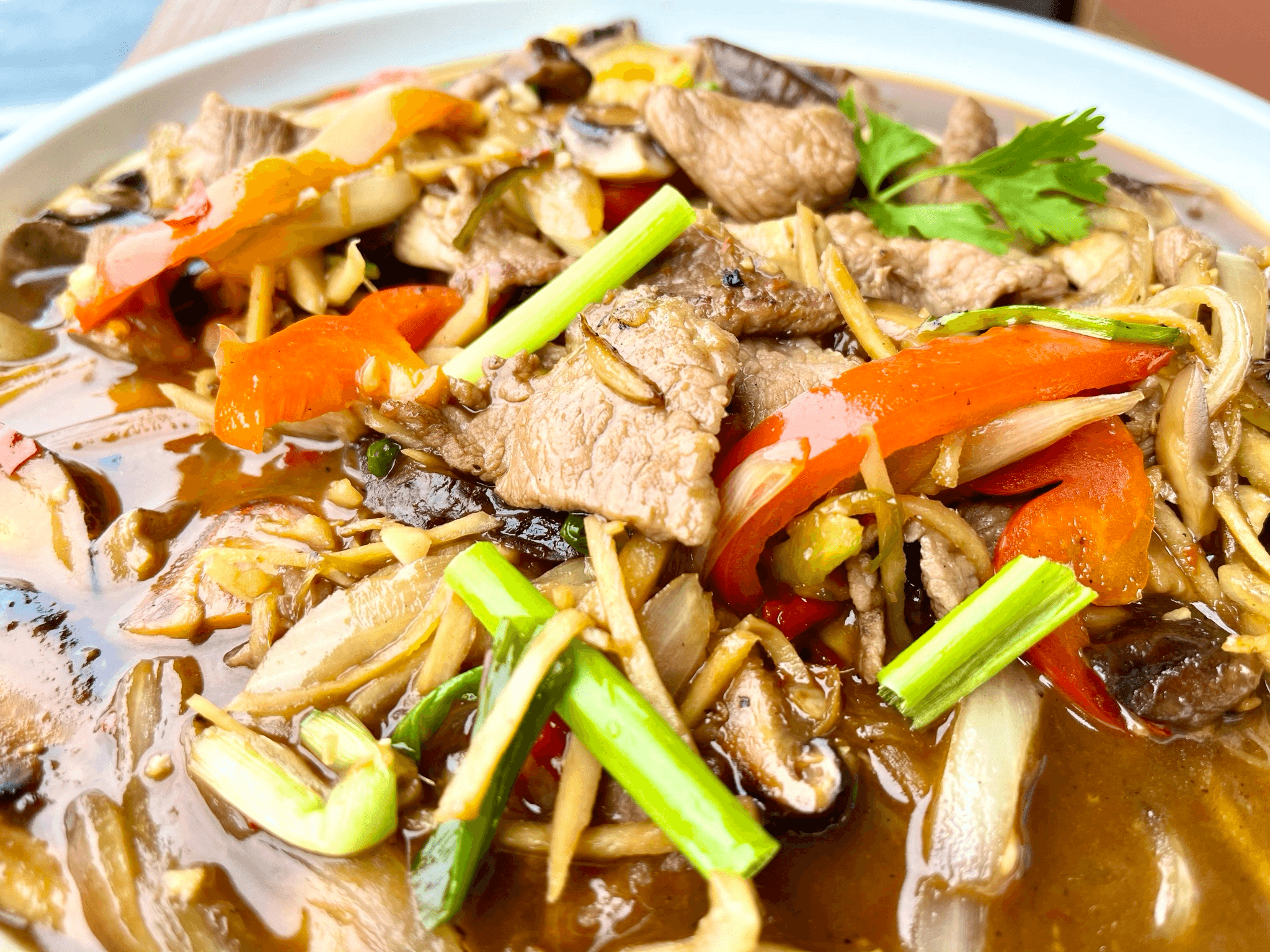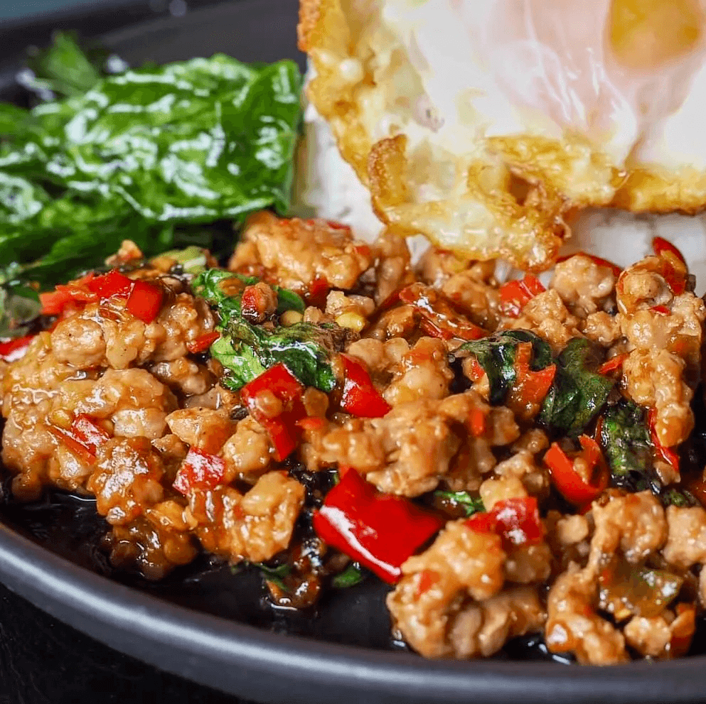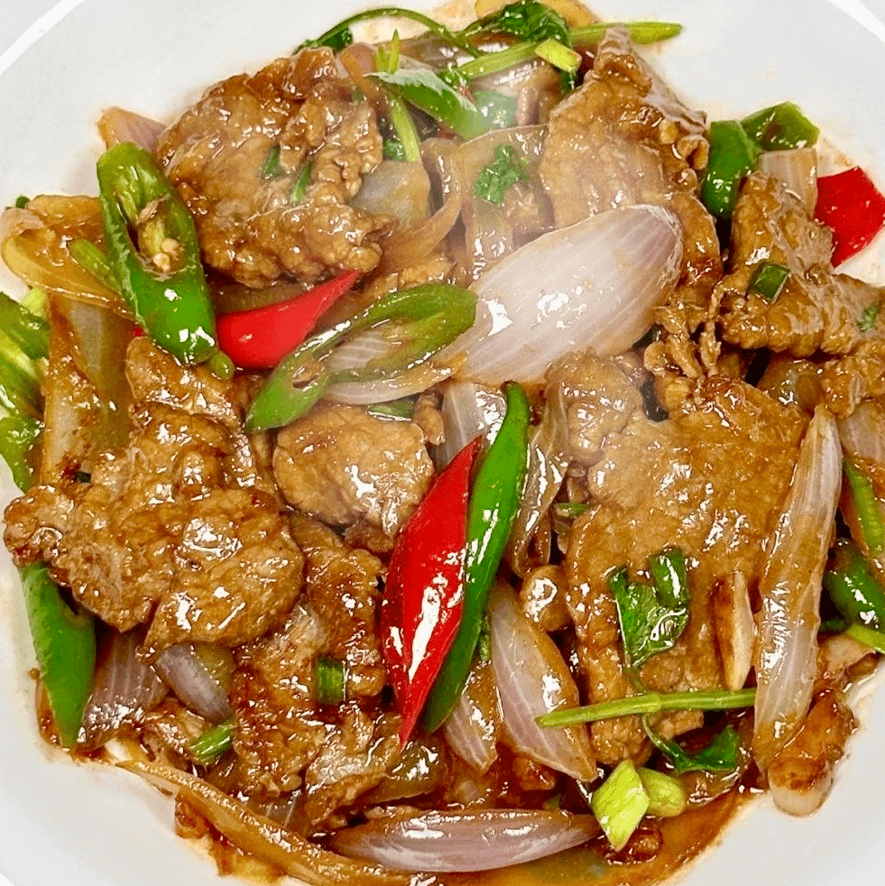 Your choice of proteins stir fried with egg (optional) tossed in tomyum paste sauce, onion, tomatoes and mushrooms, topped with spring onion and cilantro Yum!!