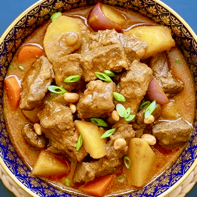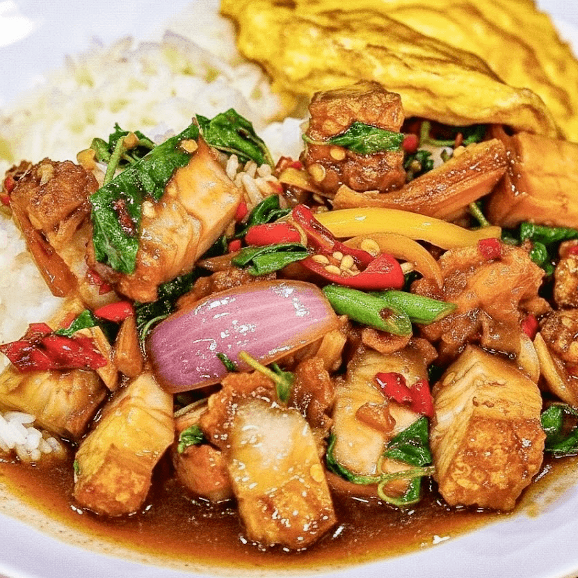 Crispy chicken bite tossed in spicy curry sauce, sweet basil, carrot and bell peppers. Served with steamed jasmine rice.