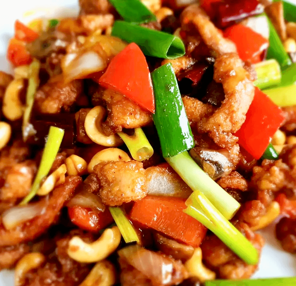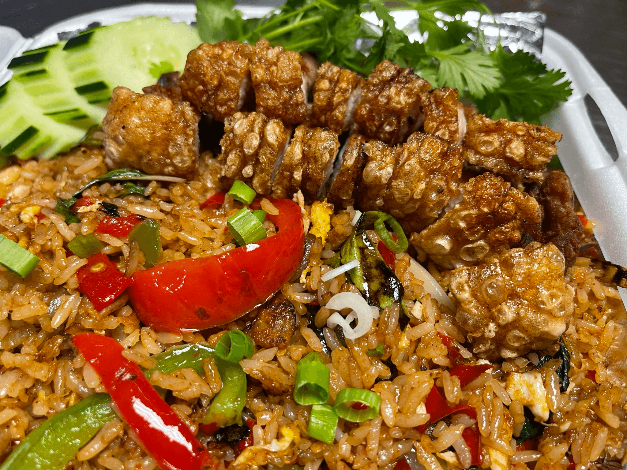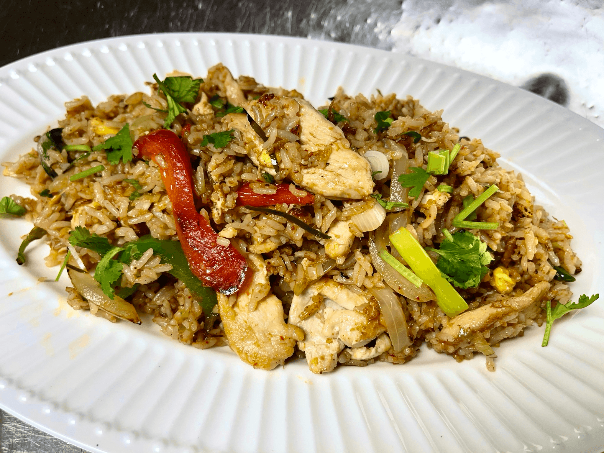 Jasmine rice stir fried with eggs (optional) your choice of proteins, cashews nut, raisin, onion, sprinkle of curry powder, black peppers topped with cilantro and spring onion.