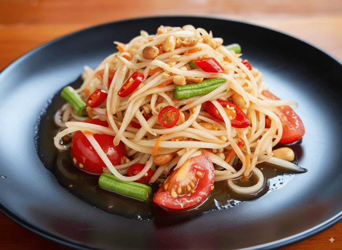 Crispy fried whole tilapia topped with crunchy green papaya salad