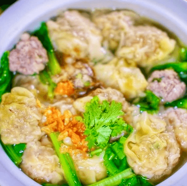 Homemade steamed pork dumpling served with soy vinaigrette topped with crispy garlic.